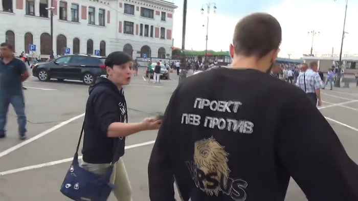 На просьбу активиста проекта "Лев против" перестать пить алкоголь и курить в общественном месте, сепаратистка “взорвалась”, бросила банку с алкогольным напитком прямо под ноги, прохожим, заматерилась и продолжила путь дальше.