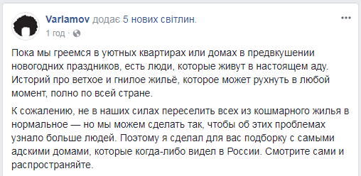 "Пока мы греемся в уютных квартирах или домах в предвкушении новогодних праздников, есть люди, которые живут в настоящем аду. Историй про ветхое и гнилое жильё, которое может рухнуть в любой момент, полно по всей стране", - пишет он в своем Facebook.