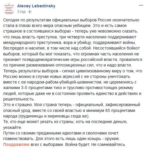 "Теперь результаты выборов - сигнал цивилизованному миру о том, что Россию можно в случае новых агрессий с ее стороны уничтожать вместе с ее народом-рабом-убийцей-шовинистом, не церемонясь с жалкими 3-5 процентами тихо и трусливо противостоящих режиму людей", - продолжил он.