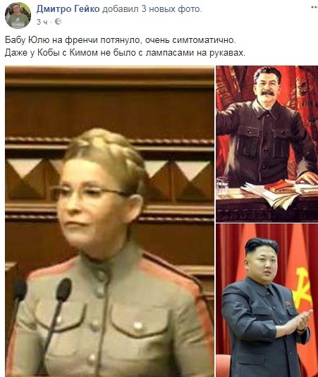 "Бабу Юлю на френчи потянуло, очень симптоматично. Даже у Кобы (советского диктатора Иосифа Сталина) с Кимом (лидером КНДР Ким Чен Ыном) не было с лампасами на рукавах", - написал Дмитрий Гейко на своей странице в Facebook.